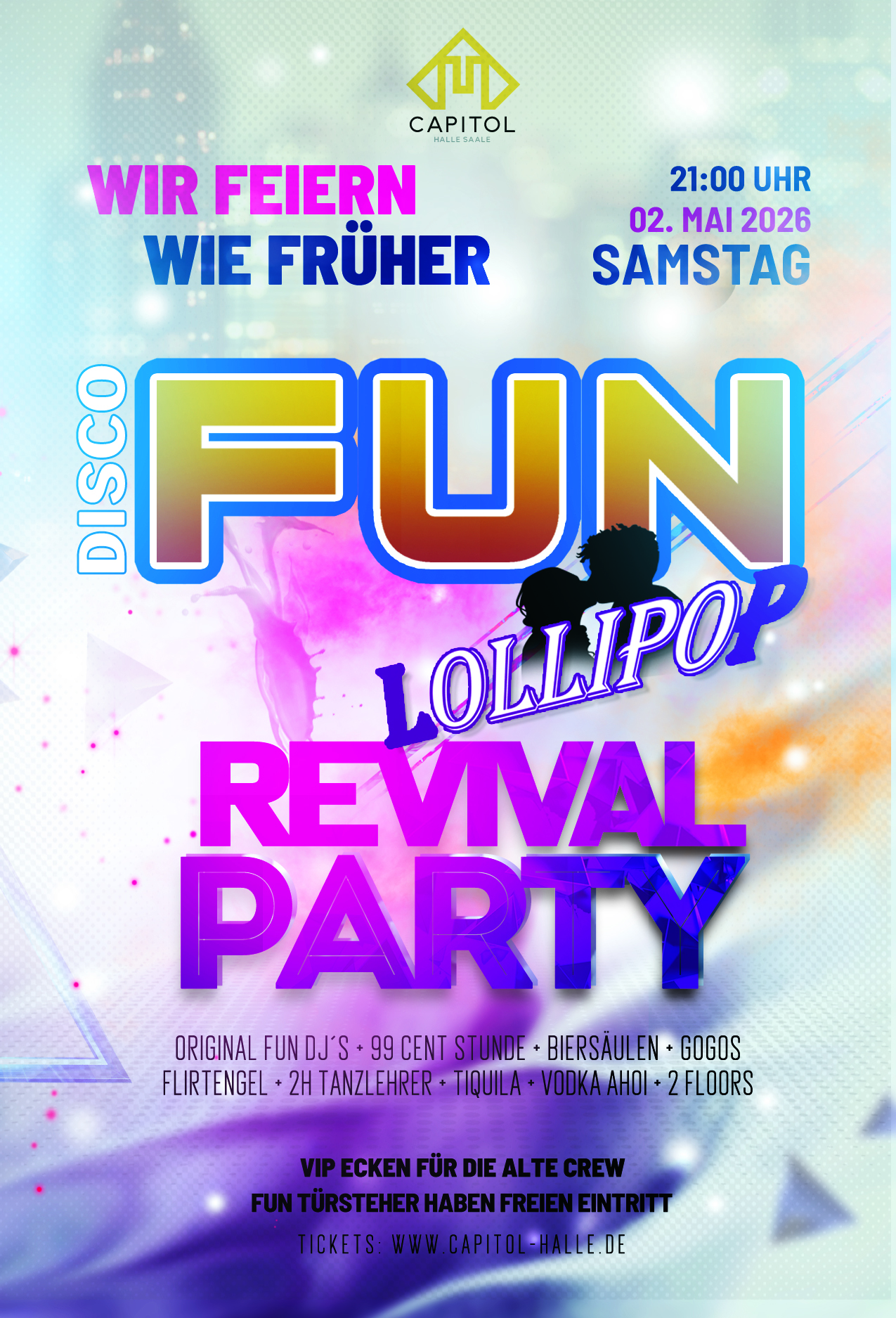 Das alles und viel mehr aus dieser Kultdisco hat uns so sehr gefehlt, dass wir es einfach für eine Nacht zurückholen. Am 02. Mai machen wir das Capitol zum guten alten FUN/Lollipop – und ihr seid hoffentlich dabei. Schnappt euch eure Clique von damals und lasst uns ein bisschen in Erinnerungen schwelgen.