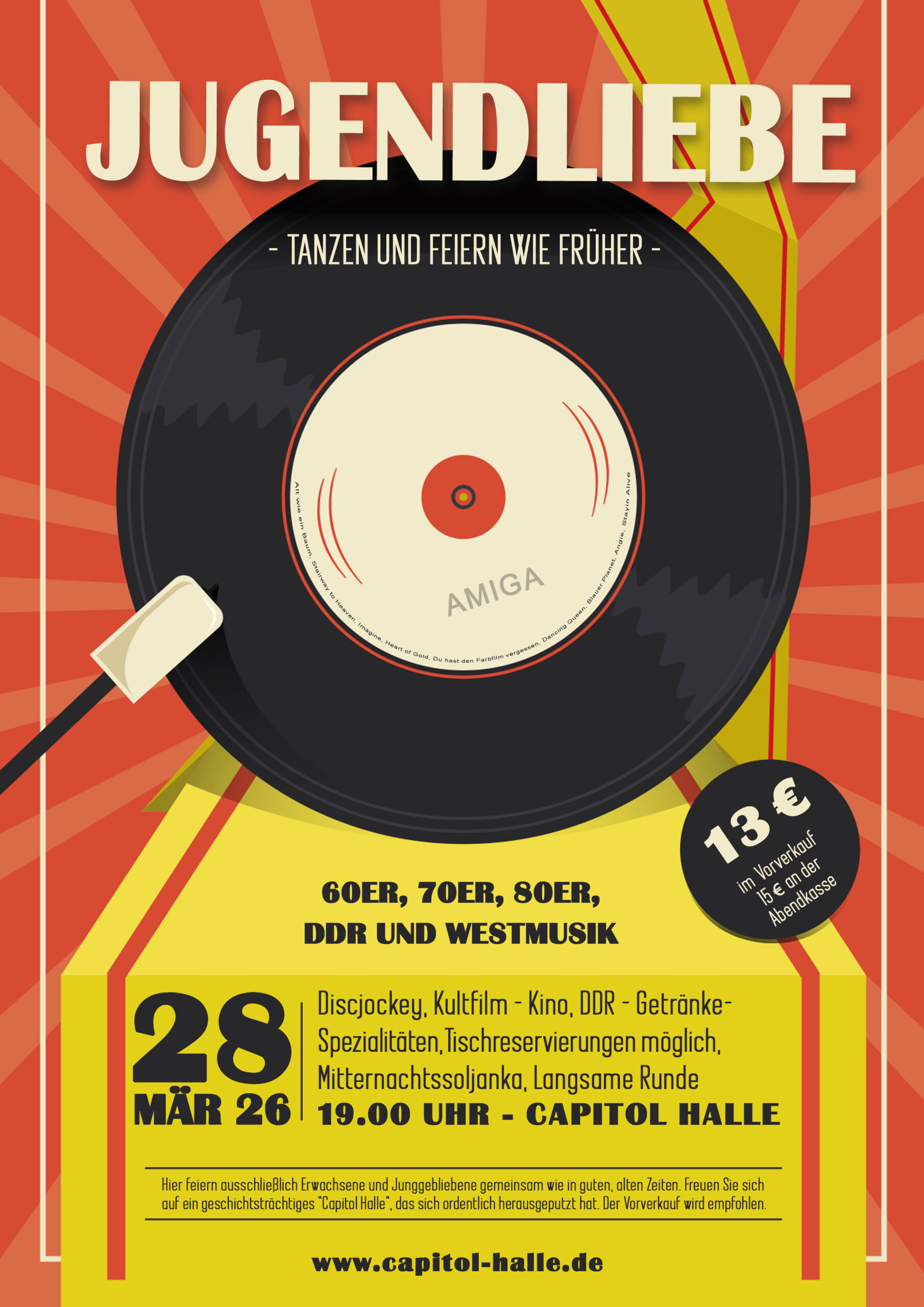Die Tanzveranstaltung für alle Erwachsenen mit einem Hauch Ostalgie und endlich wieder einem gelebten Musikverhältnis West- und DDR-Musik von 40/60. Alle Hits der goldenen Generationen, präsentiert von Discjockeys und ganz speziellen Gästen, die ihrem Namen auch endlich alle Ehre machen. „Der blaue Planet“, „I Can’t Get No Satisfaction“, „Zeit, die nie vergeht“, „I Was Made For Lovin’ You”, “Alt wie ein Baum“ und viele Hits aus vergangenen Tagen servieren die Plattenunterhalter unserem Publikum.