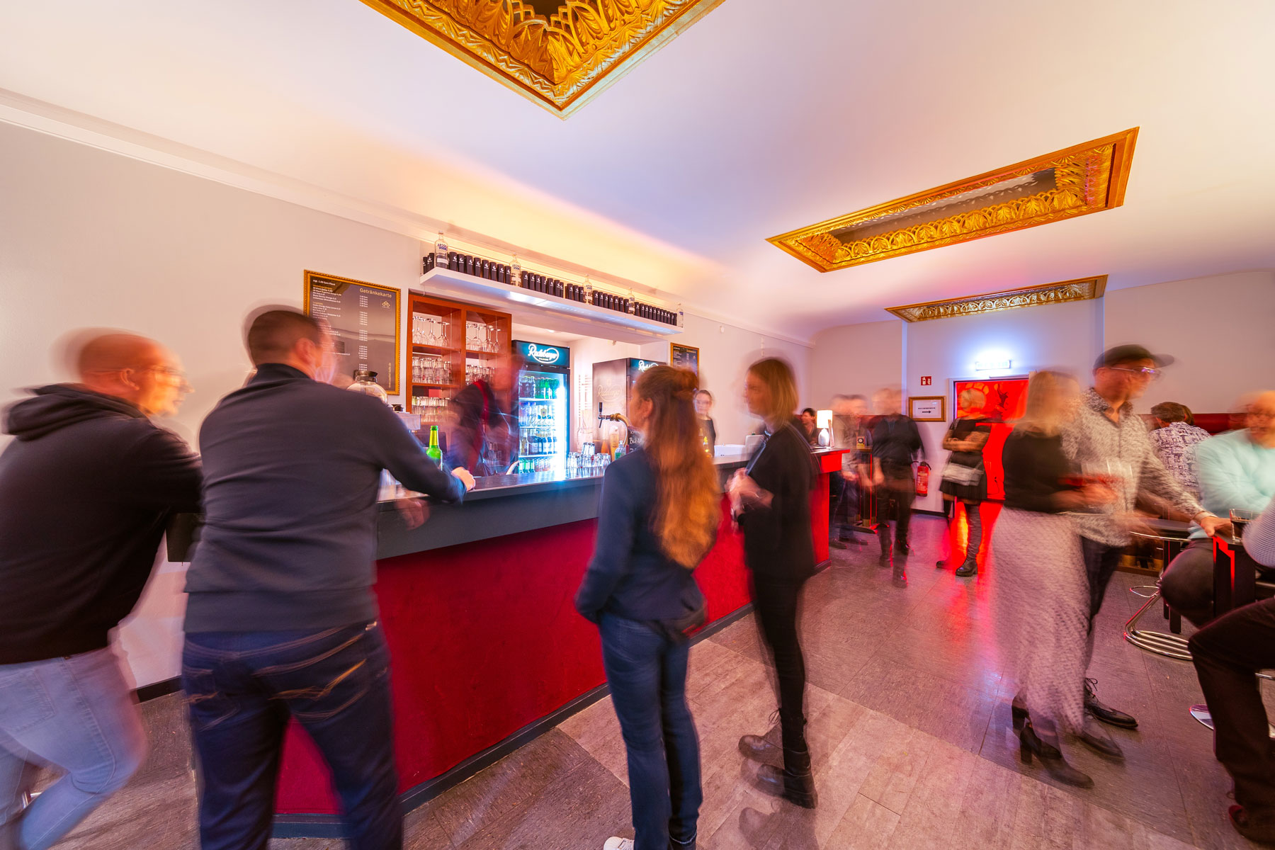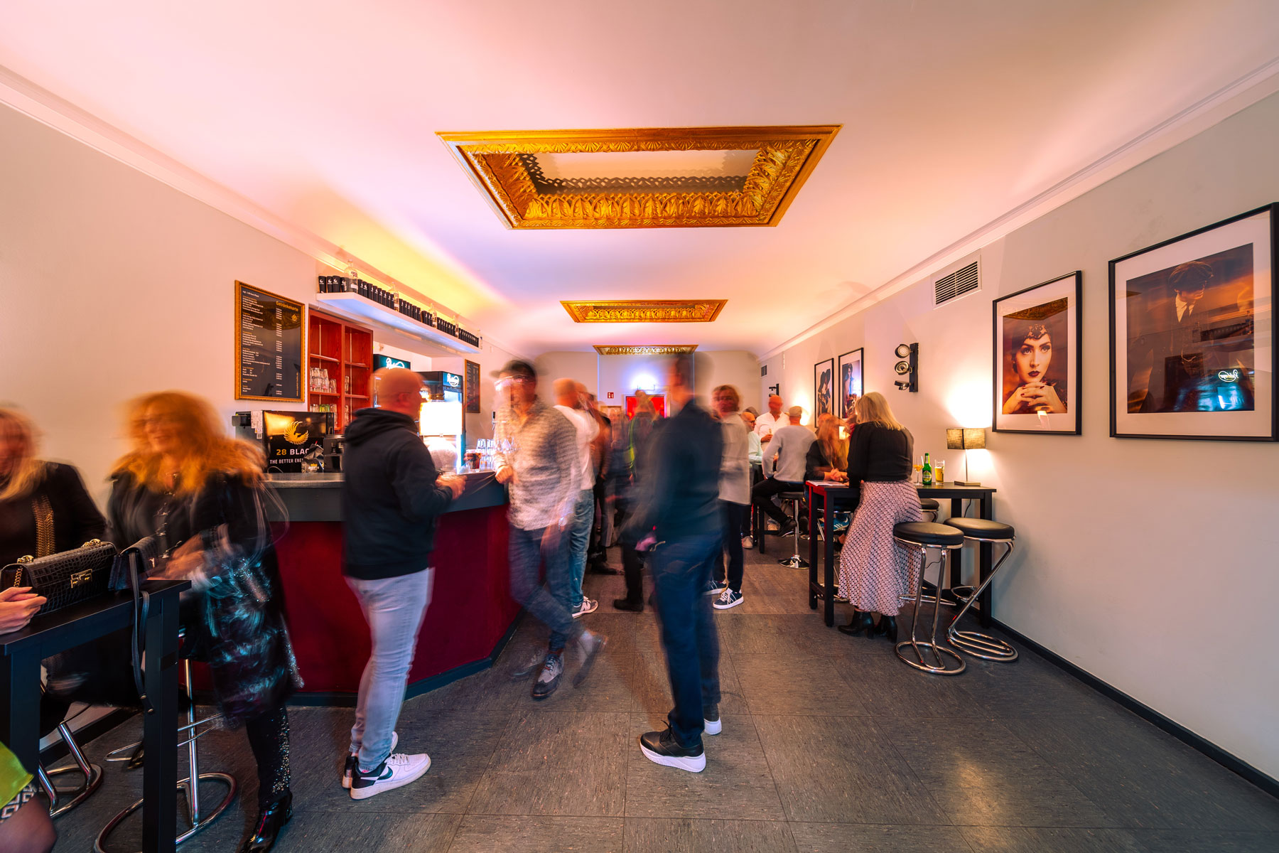 Oben angekommen bietet ein großzügiger Empfangsbereich das Art deco Café einer kleinen Bar genügend Platz für einen Stehempfang von bis zu 40 Personen bevor es in den Tagungsraum weitergeht. Das Art Deco Café normalerweise mit Stehtischen bestückt, kann mit chilligen Loungemöbeln auch zum kommunikativen Treffpunk ausgestattet werden.